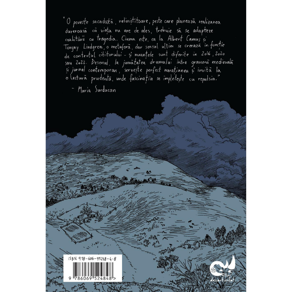 O poveste sacadată, neliniștitoare, peste care planează realizarea dureroasă că viața nu are de ales, trebuie să se adapteze coabitării cu tragedia. Ciuma este, ca la Albert Camus și Torgny Lindgren, o metaforă, dar sensul ultim se creează în funcție de contextul cititorului – și nuanțele sunt diferite în 2016, 2020 sau 2022. Desenul, la jumătatea drumului între gravură medievală și jurnal contemporan, servește perfect narațiunea și invită la o relectură prudentă, unde fascinația se împletește cu repulsia.